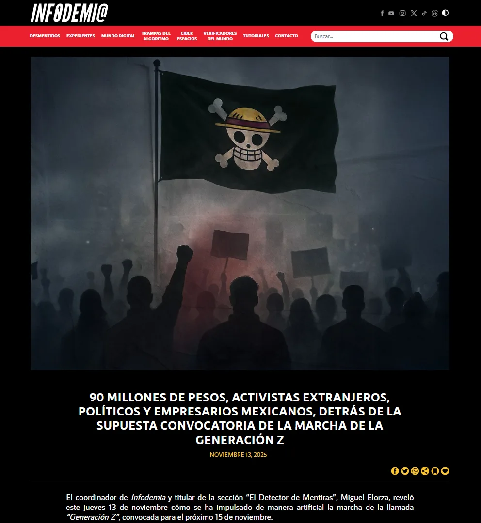 Según Infodemia y la Central de Datos e Inteligencia Artificial MilenIA, la operación digital que fogoneó la llamada Marcha de la Generación Z costó más de 90 millones de pesos mexicanos. Eso equivale a unos 5 millones de dólares. La consideraron la más grande desde la elección presidencial de 2024. El análisis concluyó que unos 8 millones de bots impulsaron la narrativa inicial en redes sociales, mientras que 9.5 millones de cuentas reales se sumaron después.