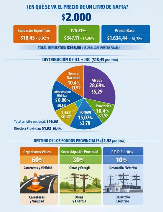 Lo perciben el Tesoro Nacional, $ 1,92, ANSES $ 5,29, Infraestructura hídrica $ 0,9, FONAVI $ 2,78 y $ 0,47, mientras las provincias reciben $ 1,92 también, como Nación.