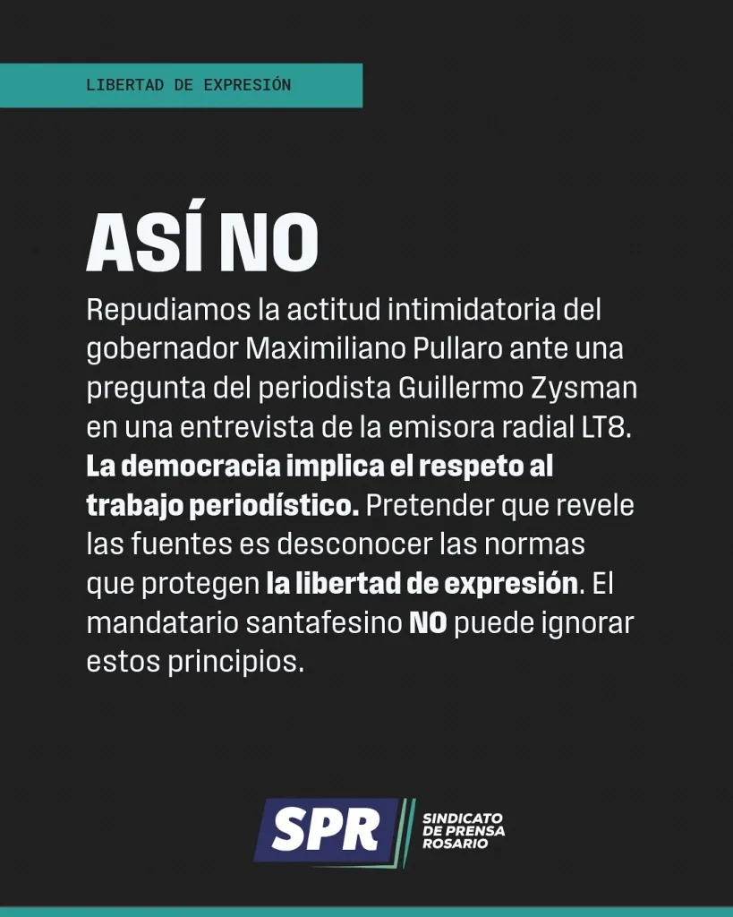 Desde el sindicato de prensa enviaron un comunicado expresando el repudio en relación a la actitud de Pullaro contra un trabajador de prensa.