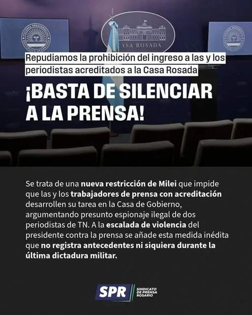 Desde el Sindicato de Prensa Rosario expresamos nuestro más enérgico repudio ante la reciente decisión del presidente Javier Milei de restringir el acceso de periodistas acreditados a la Casa Rosada, en una medida que constituye un serio retroceso para la libertad de prensa en la Argentina.