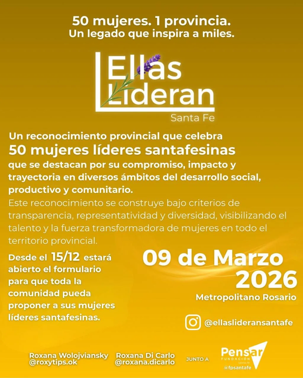 Las postulaciones podrán ser realizadas por personas, instituciones, organizaciones, cámaras empresarias u otros colectivos, a través de un formulario online disponible en las redes sociales @ellaslideransantafe o a través de Fundación Pensar Santa Fe (@fpsantafe).