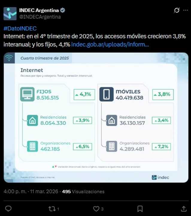 Y suma que: “En el último mes del trimestre, diciembre de 2025, los accesos residenciales representaron el 94,6% del total de accesos fijos, y tuvieron un aumento de 3,9% respecto al mismo mes de 2024. Por su parte, los accesos fijos de organizaciones, que significaron el 5,4% del total, se incrementaron 6,9% en diciembre de 2025 respecto a igual mes del año anterior”.
