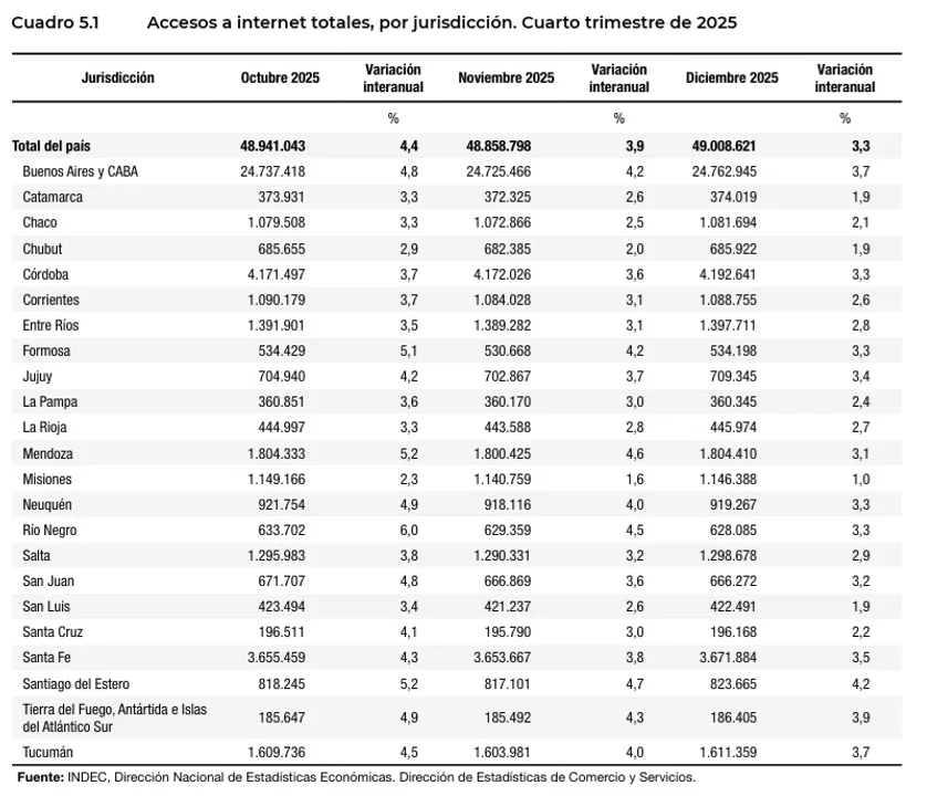 Sobre los accesos a internet fijos, el informe del INDEC detalla que: “En octubre, noviembre y diciembre de 2025 se registraron 8.475, 8.533 y 8.541 miles de accesos a internet fijos, respectivamente. Con relación al mismo mes del año anterior, se registró una suba de 4,0% en octubre, 4,2% en noviembre y 4,1% en diciembre”, detalla el informe del INDEC.