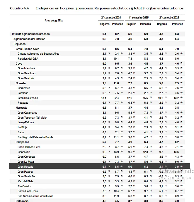 El Indec dio para el Gran Rosario (uno de los 31 aglomerados urbanos que analiza en la Encuesta Permanente de Hogares, EPH) que los hogares por debajo de la línea de la pobreza por ingresos bajaron del 23,8% calculado en el segundo semestre de 2024 al 16,6% en mismo período de 2025.