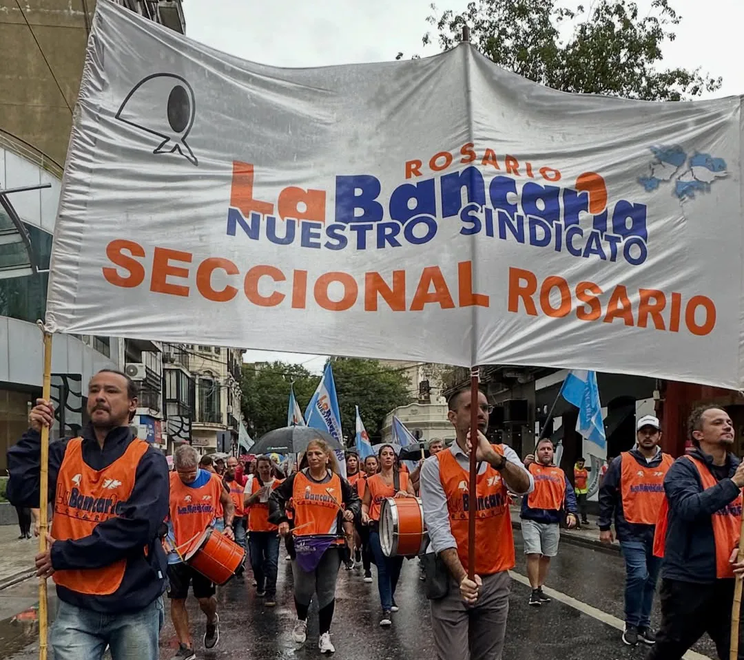 Otra presencia fuerte correspondió al sindicato La Bancaria Rosario, que adhirió a la huelga sin concurrencia a los lugares de trabajo. El gremio convocó a una movilización que recorrió Peatonal Córdoba hasta San Martín, con regreso por Santa Fe y finalización en la sede gremial de San Lorenzo 383. El secretario adjunto, Sergio Rivolta, calificó el proyecto libertario como «una regresión en leyes laborales que nos remontan a cien años atrás».
