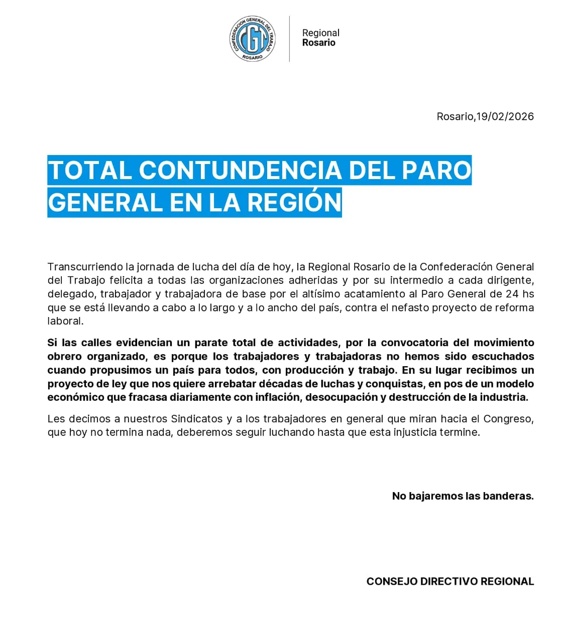 En un comunicado, la CGT Rosario evaluó la medida de fuerza en la ciudad y la región como de «total contundencia» y estimó que hubo un «altisimo acatamiento».