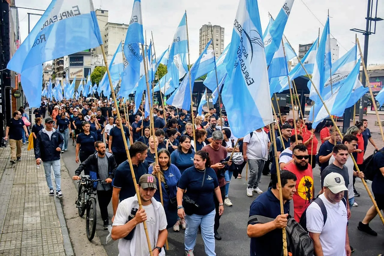 Una extensa y ruidosa columna de la Asociación Empleados de Comercio (AEC) Rosario se destacó este jueves en la marcha por el centro “como testimonio en la calle contra la nueva ley laboral” que debate la Cámara de Diputados nacional. La jornada de huelga general convocada por la CGT en rechazo del proyecto que cercena derechos históricos se notó en el casco histórico de la ciudad más que en los barrios. Incluyó piquetes de organizaciones de izquierda y la postal de oficinas públicas de todos los niveles cerradas, al igual que los bancos, y una Terminal de Ómnibus despoblada, con ausencia de colectivos urbanos.
