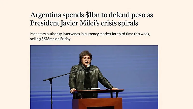 El diario económico británico Financial Times lanzó una dura crítica al plan económico del presidente Javier Milei, asegurando que «esta dinámica no es sostenible» y que «la crisis se agudiza» en Argentina. La publicación destaca que el Banco Central ha vendido más de u$s1.000 millones en tres días para intentar apuntalar al peso, en un contexto de incertidumbre política que ha «sacudido los mercados» y sembrado dudas sobre el futuro de las políticas de tipo de cambio.