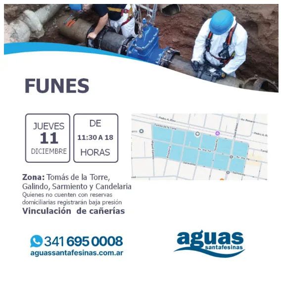 Aguas Santafesinas informa a sus usuarios que trabajará en la vinculación de una nueva perforación a la red de distribución de agua potable de la ciudad. Esta incorporación permitirá aportar 20 mil litros más por hora al sistema, con el objetivo de optimizar el servicio.