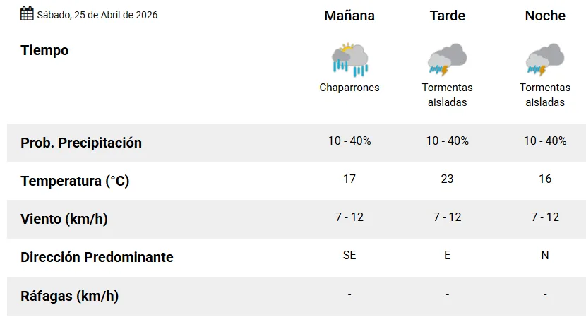 El pronóstico oficial anuncia un sábado con probabilidad de chaparrones pro la mañana y de tormentas aisladas durante la tarde y noche. La máxima estimada es de 23 grados y los vientos (leves) soplarán del Sureste, Este y Norte sucesivamente.