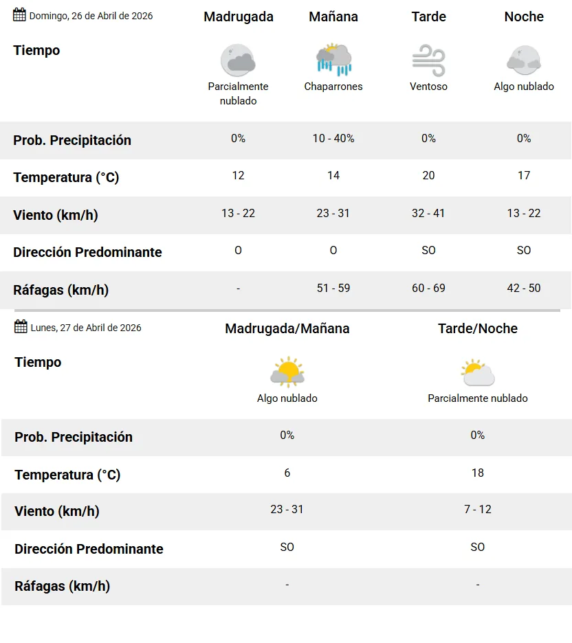 El domingo no asoma mejor. Posibilidad de chaparrones y vientos intensos en la mañana y el resto del día nublado. Con un extra: alerta por fuertes ráfagas del Suroeste por la tarde, de hasta 69 km/h. Y más fresco: la máxima prevista es de 20 grados.