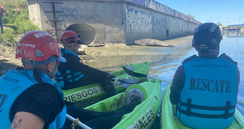 Los agentes utilizaron kayaks para mantener al animal a resguardo y aguardaron por la llegad de personal del bioparque Temaikén.