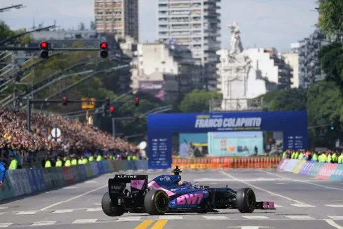 El circuito callejero por el que anduvo Franco a fuerza de trompos y aceleraciones abarcó tres kilómetros y se concentró en torno al Monumento a los Españoles. Tras la primera vuelta del mediodía, que dejó la marca de los cauchos quemados en la calle, el piloto de Alpine ya había pasado a la historia como el primer argentino en conducir una máquina de F1 por el asfalto porteño.