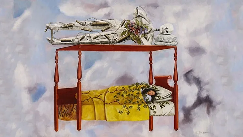 Pintado en 1940, el cuadro retrata a la artista dormida bajo el dosel de una cama mientras un esqueleto flota sobre la estructura. Según la nota de catálogo de Sotheby’s, la pieza condensa el clima emocional de un año particularmente convulso para Kahlo, marcado por el dolor físico persistente, la inestabilidad de su relación con Diego Rivera y una profunda reflexión sobre la muerte, tema recurrente en su obra.