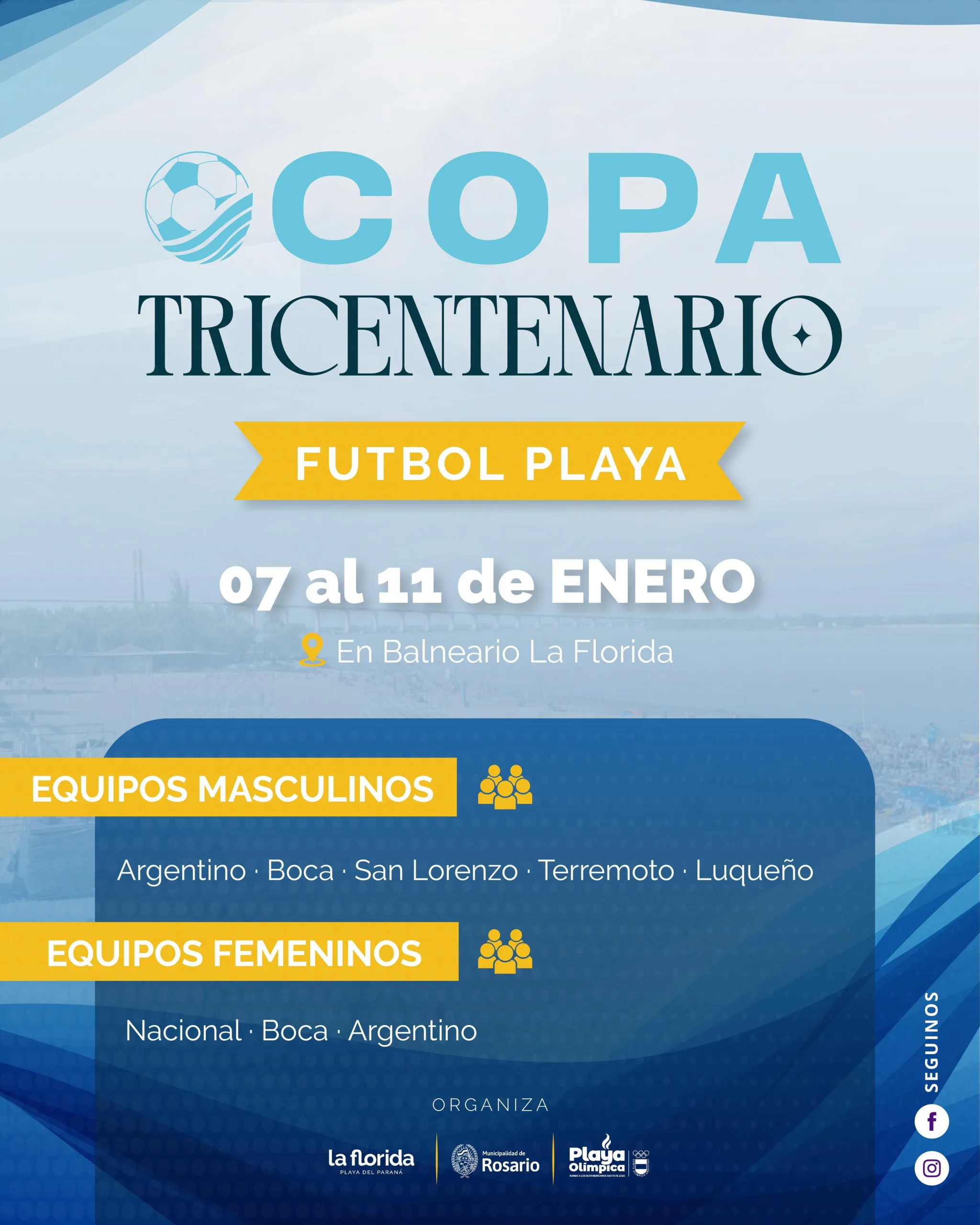 Rosario vivirá un acontecimiento deportivo sin precedentes en el marco de sus 300 años de historia. Del 7 al 11 de enero de 2026, el Balneario La Florida, convertido en Playa Olímpica, será sede de la Copa Tricentenario Ciudad de Rosario – Fútbol Playa, un torneo de jerarquía internacional que cuenta con el apoyo de la Asociación del Fútbol Argentino (AFA) y el acompañamiento del Comité Olímpico Argentino (COA).