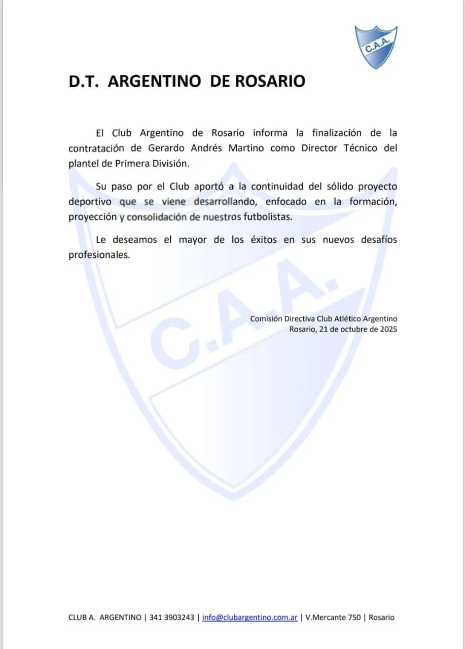 Argentino informó en la jornada de este jueves que Gede Martino dejó de ser el entrenador del plantel profesional albo, por lo que ahora deberá buscar un nuevo conductor para la temporada 2026 de la Primera C. La noticia llegó a través de un comunicado de prensa emitido por la entidad de barrio Sarmiento.