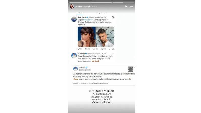 La actriz eligió su cuenta de Instagram para dar su versión de los hechos. Siciliani desmintió la información y despejó cualquier duda: “Esto no es verdad. Al margen, aclaró. Háganse el favor de escuchar Día 3 que es un discazo”.