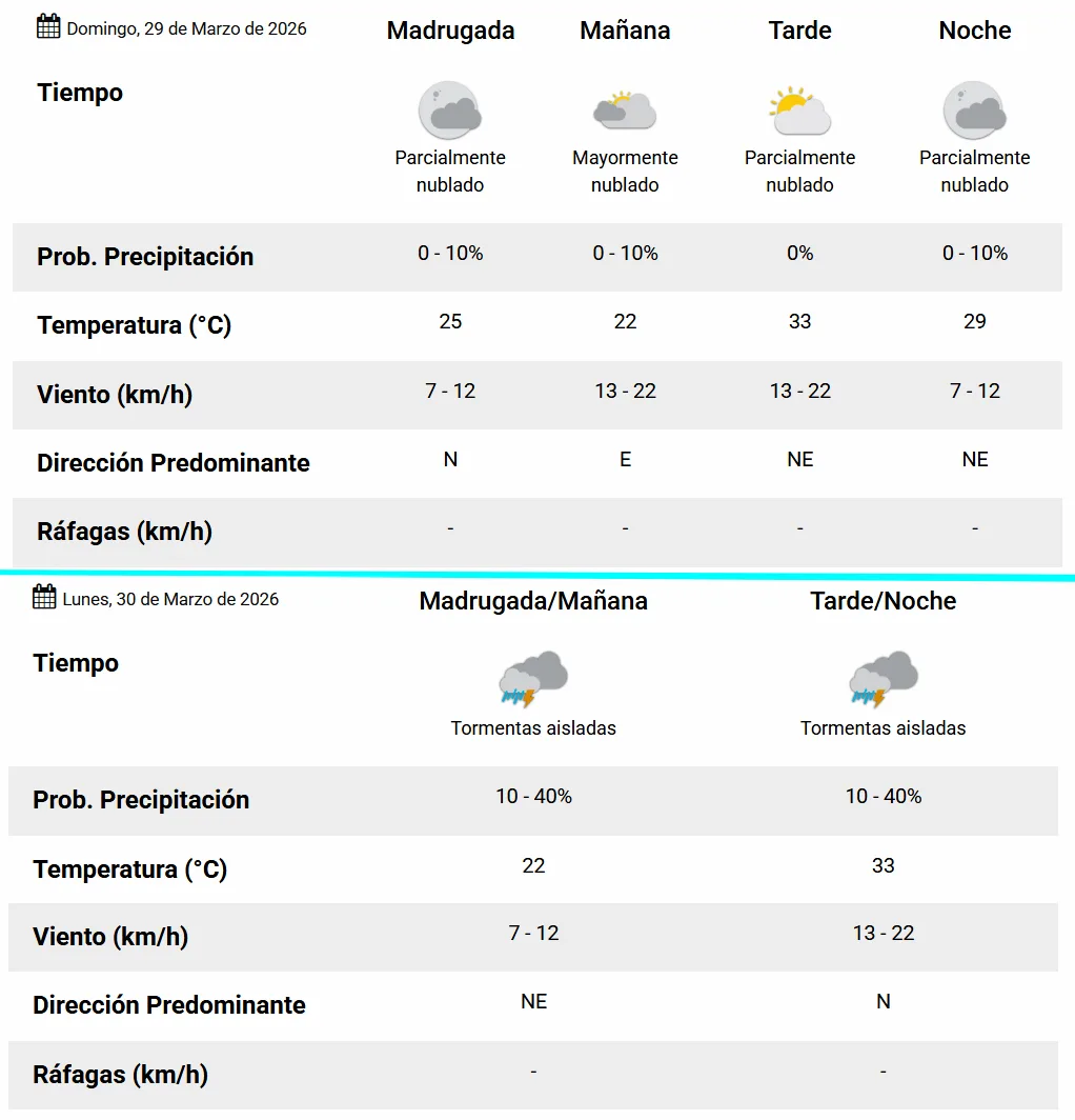 El domingo asoma caluroso pero sin agua. La máxima prevista es de 33 grados. El cielo, nublado de arranque y despejándose un poco hacia la tarde. Los vientos, cambiantes pero leves, soplarán del Norte, Este y Noreste sucesivamente a lo largo de la jornada.