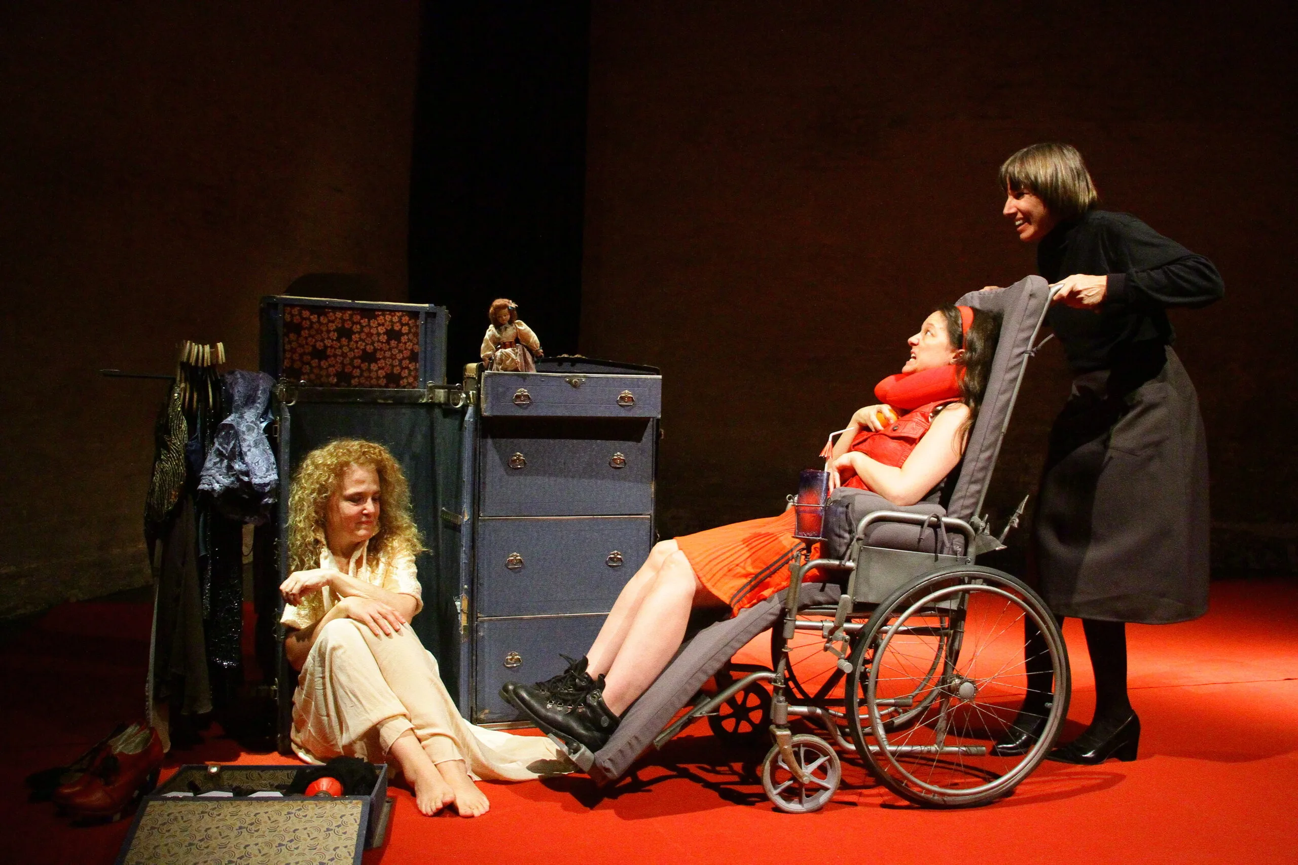 En ese viaje de emociones fuertes donde deseo e incomunicación van a la par, que Guirado dosifica con un humor que le es propio y que fue encontrando dentro mismo de la tragedia con el paso del tiempo, aparece el teatro dentro y fuera de esa mirada: la madre que llega tras la muerte de su última pareja trae consigo un puñado de objetos que se vuelven cómplices de una oda mágica donde conviven, entre otros, de Shakespeare a Lorca y su Llanto por Ignacio Sánchez Mejías, aunque todo por momentos remita más una versión bizarra de La casa de Bernarda Alba y su “mar de luto” cuidadosamente iluminado sobre un fulgurante tapete rojo.