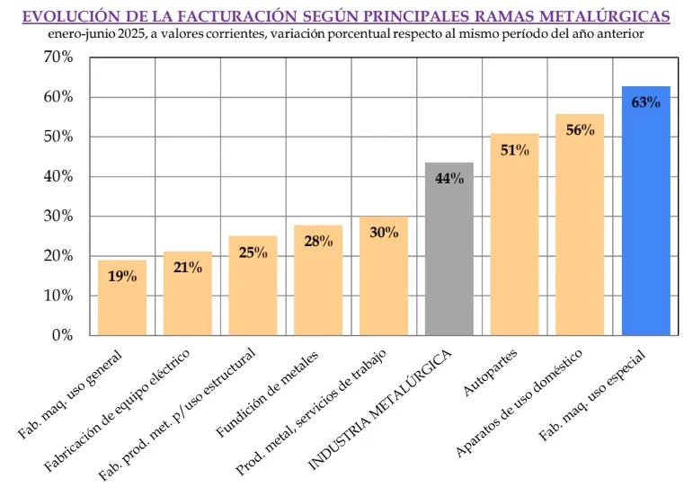 La facturación a valores corrientes del conjunto de la INDUSTRIA METALÚRGICA, y la de sus principales ocho ramas de actividad, presentó en la medición acumulada al primer semestre de 2025 los siguientes resultados en relación al mismo período del año anterior: Maquinaria de uso especial: 63%, Aparatos de uso doméstico: 56%, Autopartes: 51%, INDUSTRIA METALÚRGICA: 44%, Productos de metal, servicios de trabajo: 30%, Fundición de metales: 28%, Productos metálicos p/uso estructural: 25%, Equipo eléctrico: 21%, Maquinaria de uso general: 19%. Por su parte, el nivel general del índice de precios al consumidor registró en ese período una suba interanual media de 57% frente a 2024. Así, la facturación a valores corrientes de la industria metalúrgica en su conjunto, -y la de siete de sus principales ocho ramas-, se ubicó por debajo de la tasa de inflación revelando la caída generalizada del nivel de facturación real en el primer semestre del año.