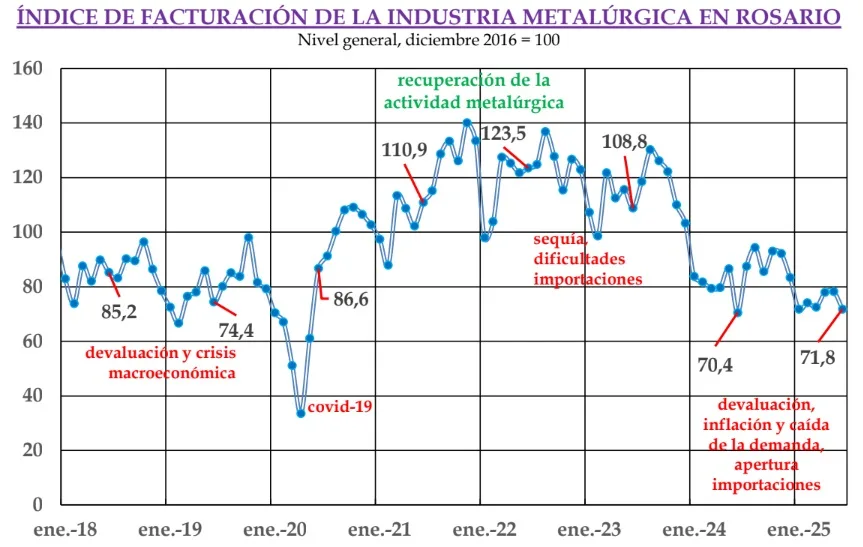 De acuerdo al último informe mensual de la Asociación de Industriales Metalúrgicos, El indicador de facturación total de los locales habilitados en la ciudad de Rosario registró en el mes de mayo de 2025 una caída de 7,6% interanual a valores constantes. El nivel de actividad económica local enfrenta fuertes retrocesos desde comienzos de 2024 y hasta el presente. En 2024 el indicador de facturación real registró una disminución de 16,6% en relación al año anterior. Acentuando el panorama recesivo, en el período enero-mayo de 2025 acumuló una nueva baja de 7,3% en relación al año pasado. Por su parte, la facturación real de la industria manufacturera en Rosario registró en cinco meses de 2025 un reiterado y marcado retroceso de 13,2% interanual.