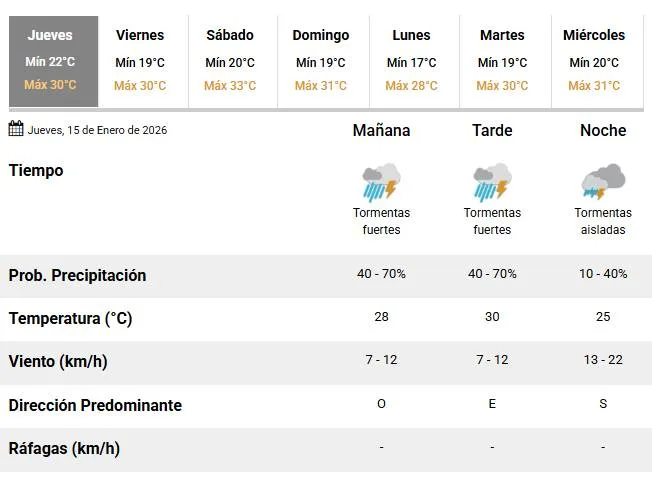 El Servicio Meteorológico Nacional (SMN) anunció para este 15 de enero una temperatura mínima de 22 °C y una máxima que rondará los 30 °C.