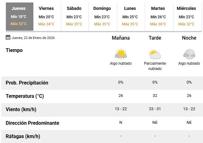 Vientos del norte en la mañana y a partir de la tarde del noreste. El cielo estará algo nublado en la mañana, parcialmente nublado en la tarde y algo nublado en la noche.