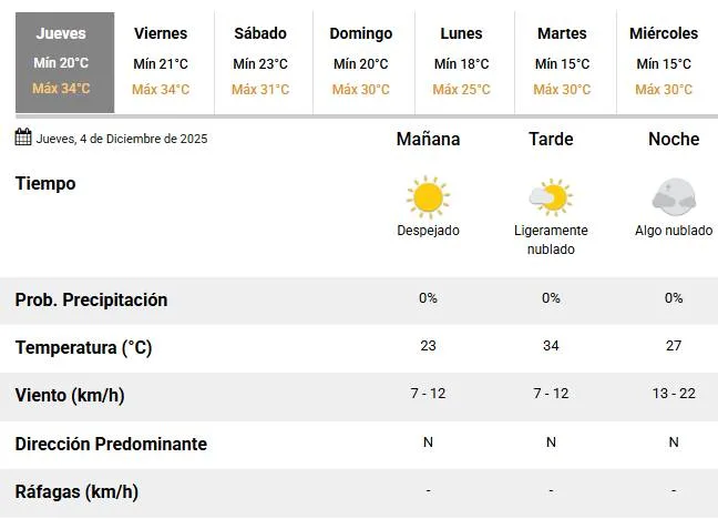 Buen tiempo en la ciudad y con mucho calor. El Servicio Meteorológico Nacional (SMN) anunció para este 4 de diciembre una temperatura mínima de 20°C y una máxima que rondará en los 34°C.