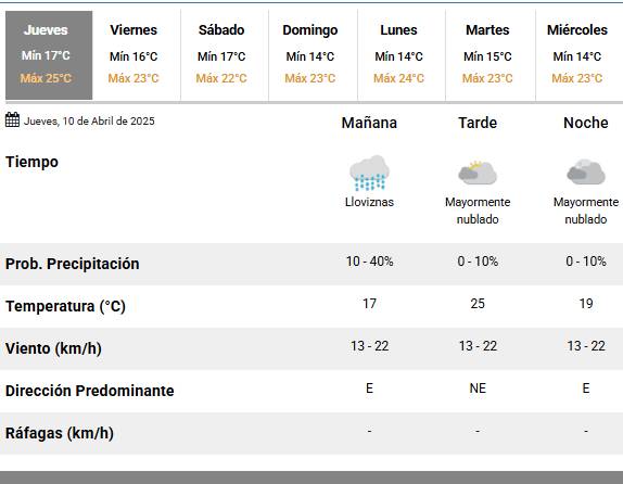 Jueves con lloviznas en la ciudad que perdurarán hasta a mañana, luego por la tarde y noche el cielo estará mayormente nublado. El Servicio Meteorológico Nacional (SMN) anunció para este 10 de abril una temperatura mínima de 17 °C y una máxima que rondará en los 25 °C.