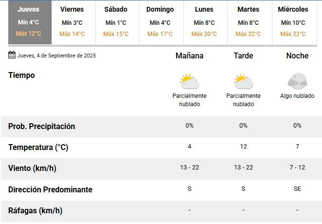 Jueves con frío. El Servicio Meteorológico Nacional (SMN) anunció para este 4 de septiembre una temperatura mínima de 4°C y una máxima que rondará en los 12 °C.