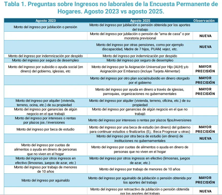 En primer lugar, el trabajo destaca modificaciones introducidas por el Indec en la Encuesta Permanente de Hogares (EPH) que permiten relevar con mayor precisión ingresos no laborales, como la Tarjeta Alimentar, las pensiones no contributivas y el programa Progresar. Esta mejora en la captación estadística implica que ingresos que antes estaban subregistrados ahora aparecen reflejados en las mediciones, elevando el ingreso total de los hogares (en particular en los segmentos de menores recursos) y reduciendo así la incidencia de la pobreza.