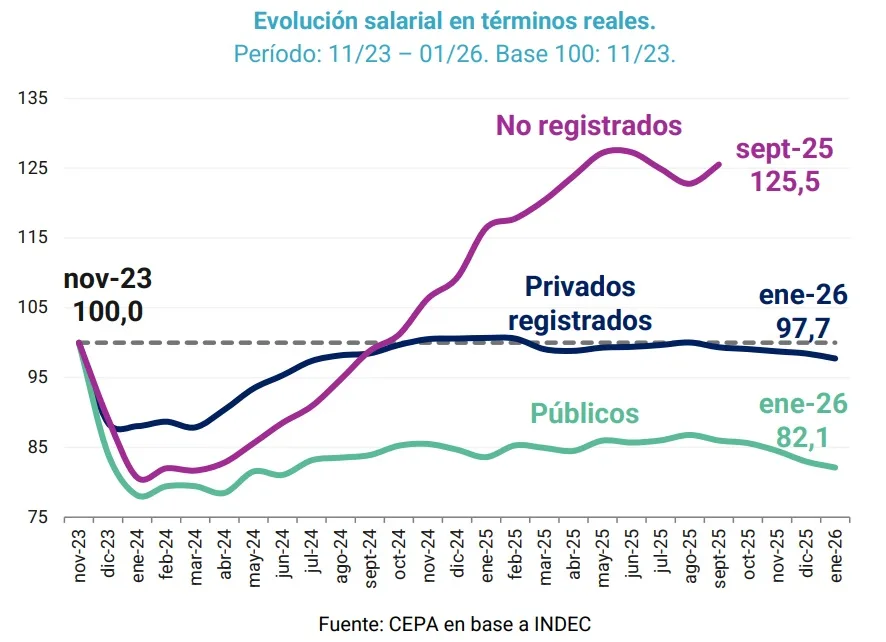 Otro de los puntos señalados por CEPA refiere a la dinámica de los ingresos de los trabajadores no registrados. Según los datos oficiales, este segmento habría experimentado un incremento real del 25,5% entre noviembre de 2023 y septiembre de 2025. El dato resulta llamativo en un contexto de contracción del mercado laboral, con caída del empleo y aumento de la desocupación.