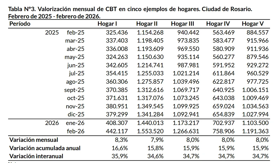 En febrero, para no ser estadísticamente indigente en Rosario, la misma familia tipo de dos adultos de alrededor de 40 años con hijos entre 6 y 10 años necesitó 779.392 pesos sólo para alimentos mínimos para vivir. En el primer bimestre de 2026, los alimentos en la ciudad acumularon una suba del 18,7%.