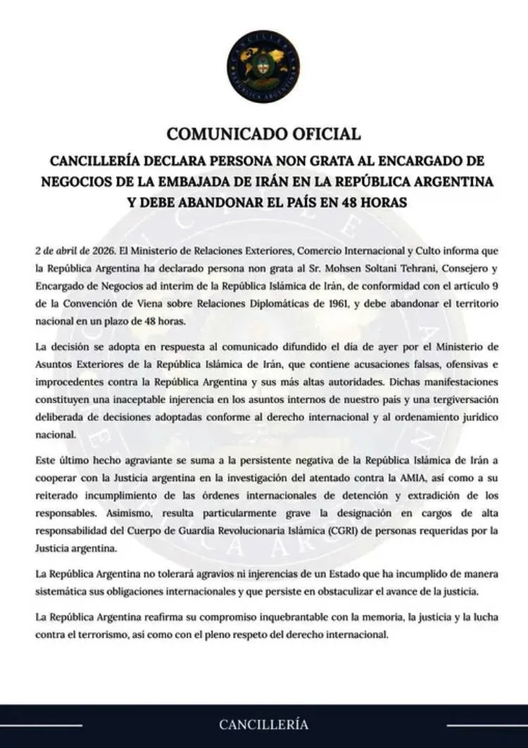 La Cancillería Argentina instó al encargado de negocios de Irán a abandonar al país en 48 horas, tras declararlo persona no grata, tal como lo afirmó el comunicado publicado por la cartera liderada por Pablo Quirno.