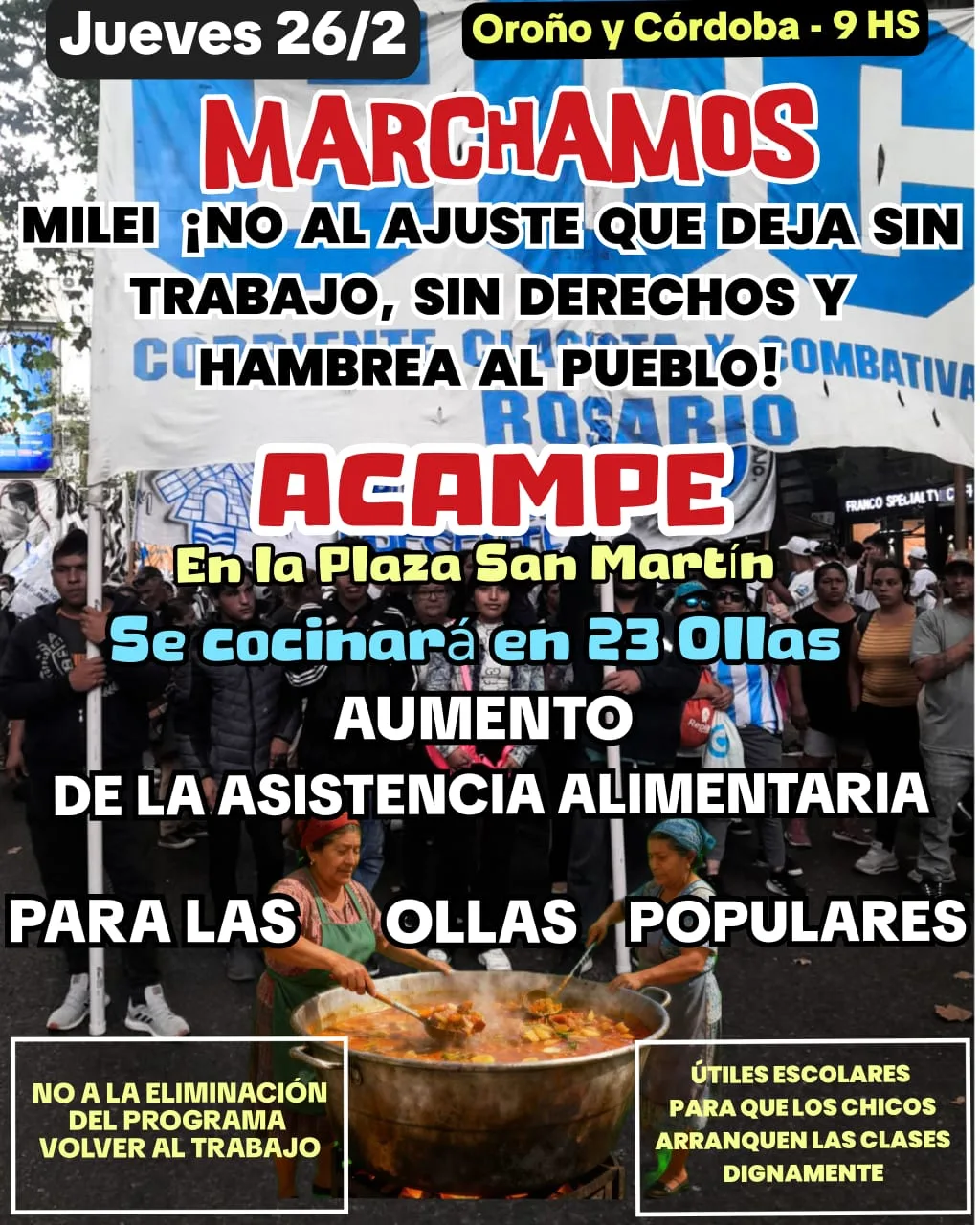 La Corriente Clasista y Combativa inició este jueves un acampe con la instalación de ollas populares en la plaza San Martín, frente a la sede de la Gobernación, para hacer oír varios reclamos. Entre ellos, la continuidad de los planes Volver al Trabajo que el Gobierno nacional anunció que dará de baja, ayuda alimentaria para los comedores barriales que sostienen y asistencia para la compra de útiles escolares por parte de la provincia de Santa Fe. Referentes de la organización social adelantaron que si no obtienen respuestas a sus pedidos seguirán en el espacio de Moreno y Santa Fe.