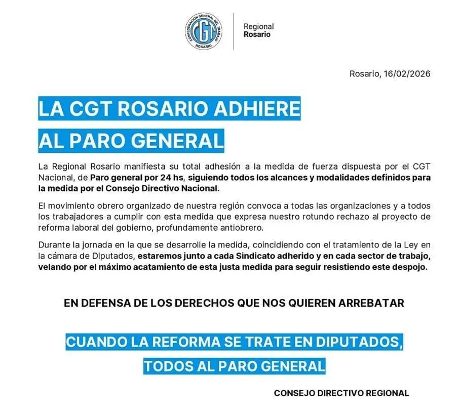 La Regional Rosario manifestó su total adhesión a la medida de fuerza dispuesta por el CGT Nacional, de paro general por 24 horas, «siguiendo todos los alcances y modalidades definidos para la medida por el Consejo Directivo Nacional.
