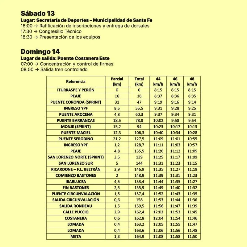 Los equipos arribarán el sábado 13 a la Secretaría de Deportes en Santa Fe, donde se realizará la presentación oficial a las 18.30 en la Costanera Oeste. La competencia comenzará el domingo a las 7 en el Puente Colgante, en “tren controlado” hasta Iturraspe y Perón. La largada efectiva será a las 8.15. La carrera tiene una duración estimada de cuatro horas y finalizará en el Parque Alem de Rosario.