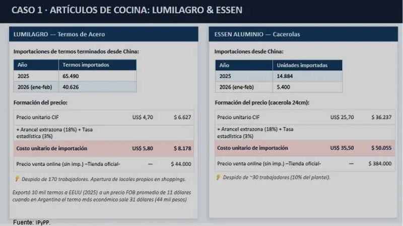 Essen: importa cacerolas de China con un costo unitario (incluyendo fletes e impuestos) de unos $50.000. En sus canales de venta se ofrecen a $384.000 (sin contar impuestos nacionales). Despidió 30 trabajadores.