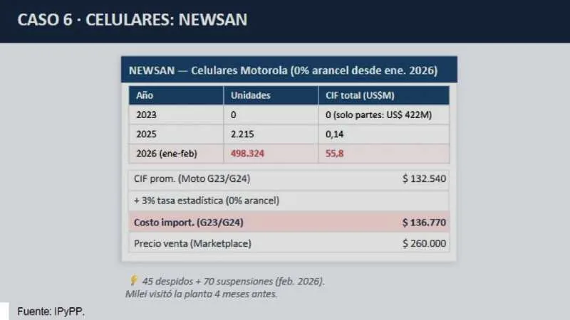 Lo mismo ocurre en el sector electrónico. Newsan, en Tierra del Fuego, pasó de importar partes para ensamblar celulares a traer equipos terminados (como los modelos Motorola G23/24). Esto vino de la mano de despidos y suspensiones a principios de 2026.