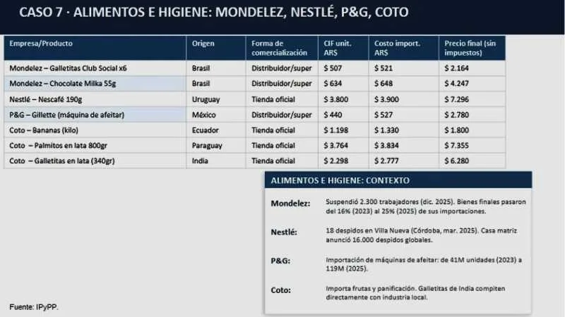 Mondelez: suspendió 2.300 trabajadores a fines de 2025 y los bienes finales pasaron del 16% (2023) al 25% (2025) de sus importaciones. El costo unitario de importar la galletita Club Social es de $521 y lo vende a $2.164.