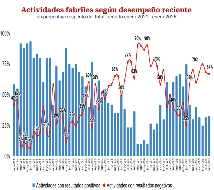 En diciembre de 2022, y por cuarto mes consecutivo, creció hasta el 60% la porción de actividades industriales que acusaron menor producción en términos interanuales. Con trayectoria positiva en los últimos seis meses de destacan importantes actividades: galletitas, productos de panadería y pastas; curtido de cueros; artículo de cemento y de yeso; envases de vidrio; fundición; productos metálicos para uso estructural; maquinaria de uso general y especial; otros productos de metal y servicios de trabajo de metales; equipos y aparatos eléctricos, y vehículo automotores. Contrariamente, productos lácteos; molienda de cereales; madera; asfalto e instrumentos médicos enfrentan menor actividad en los últimos seis meses.