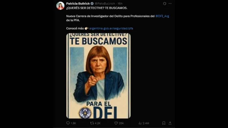 La ministra de Seguridad, Patricia Bullrich, lanzó una -de mínima polémica-convocatoria para profesionales universitarios a integrar la nueva Departamento Federal de Investigaciones (DFI) de la Policía Federal Argentina (PFA). El afiche generado con IA que la promociona imita la icónica imagen del personaje estadounidense “Tío Sam”