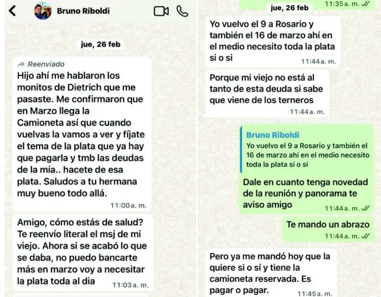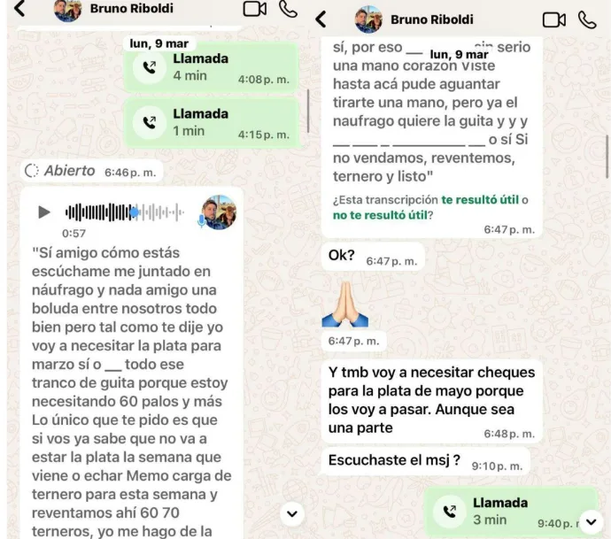 En uno de los mensajes más comprometedores, fechado el 26 de febrero, un día después de una venta de 161 animales, Riboldi le escribió a Coscia: “Ahí en el medio necesito toda la plata sí o sí. Porque mi viejo no está al tanto de esta deuda”. En otro tramo, el influencer agrega: “Confío en vos 100% y en la amistad que tenemos… si esto sale a la luz mi viejo me liquida”.