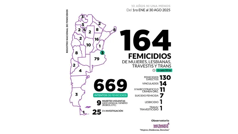 Según el último informe presentado por Mumalá (Mujeres de la Matria Latinoamericana), entre el 1° de enero y el 31 de agosto de 2025 se registraron 24 muertes violentas de mujeres en la provincia, en un contexto nacional donde, en promedio, ocurre un femicidio cada 35 horas.
