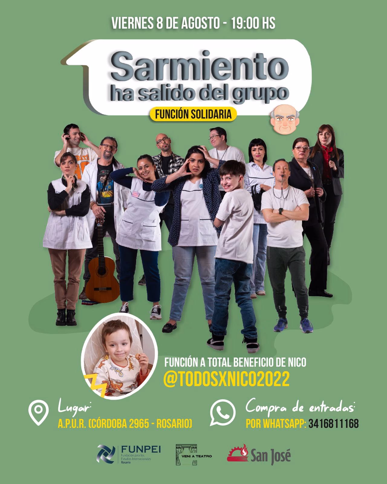 Una obra de teatro solidaria. El grupo «Sarmiento ha salido del grupo» esta vez sale al escenario con un propósito más grande: el viernes 8 de agosto, desde las 19, llega una función especial de teatro a total beneficio de Nico, un niño rosarino de 8 años que necesita continuar su tratamiento contra el cáncer en Nueva York.