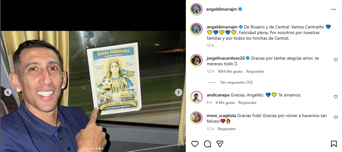 El rol de Cardoso en la vida deportiva de su marido es activo, tanto que muchas veces es apuntada tanto para elogiar como para criticar a Di María. La contracara del fanático leproso se vio con un posteo de Fideo. Después del partido, subió una publicación festejando la victoria de visitante y entre las fotos del festejo, sumó una selfie muy sonriente junto a una estampita de «Santa Jorgelina, patrona canalla».