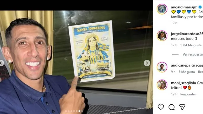 El rol de Cardoso en la vida deportiva de su marido es activo, tanto que muchas veces es apuntada tanto para elogiar como para critiar a Di María. La contracara del fanático leproso se vio con un posteo de Fideo. Después del partido, subió una publicación festejando la victoria de visitante y entre las fotos del festejo, sumó una selfie muy sonriente junto a una estampita de «Santa Jorgelina, patrona canalla».