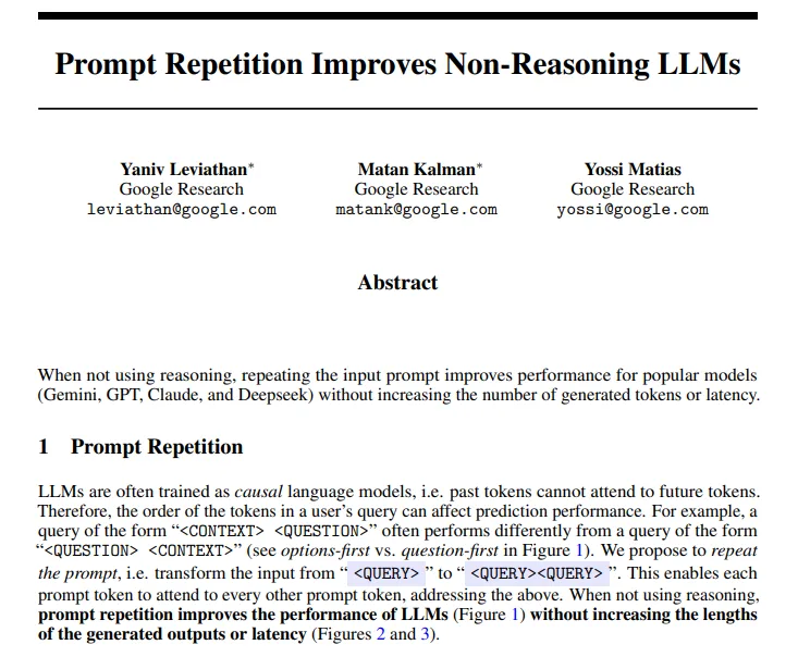 «Demostramos que repetir las indicaciones mejora de forma consistente el rendimiento del modelo para una variedad de modelos y pruebas comparativas, cuando no se utiliza razonamiento», señalan los investigadores en su paper.