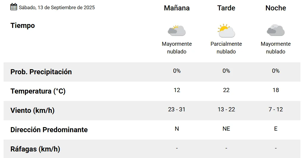 El miércoles asoma parecido: mínima de 16 y máxima de 25 grados, con viento del Noreste que se mantendrán hasta el viernes.