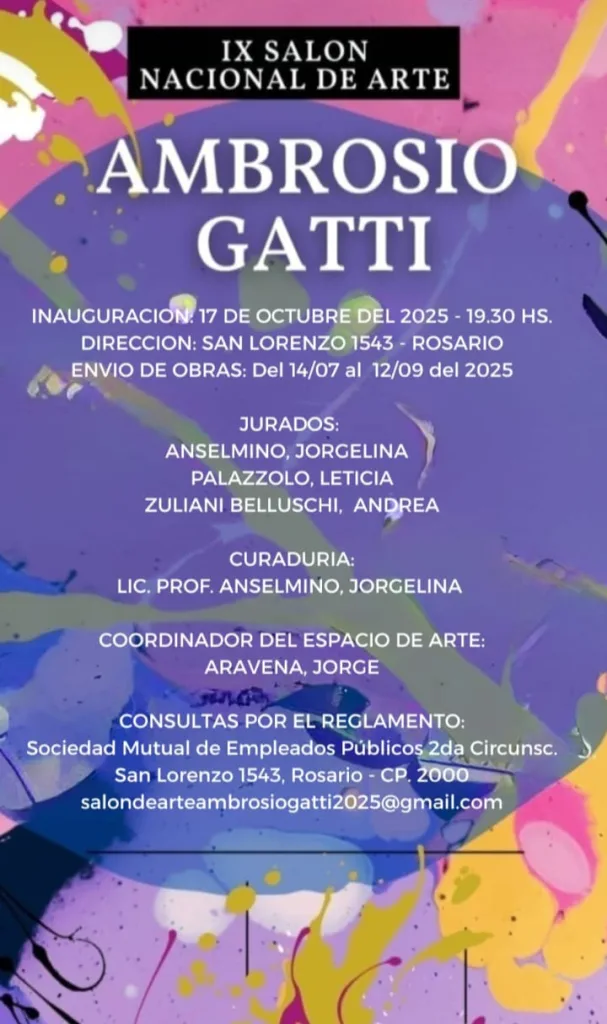 El viernes 17 se podrá disfrutar del Gran Salón de Artes Ambrosio Gatti en la Sociedad Mutual de Empleados Públicos de Segunda Circunscripción (San Lorenzo 1543), con entrada libre y gratuita. Desde las 19.30 se podrá apreciar un centenar de obras de toda la región, bajo la coordinación de Jorge Aravena y la curaduría de la licenciada, profesora y conservadora de museos Jorgelina Anselmino, integrante del Centro de Estudios Teórico Críticos sobre Arte y Cultura Latinoamericana (Cetcacl), de la UNR.